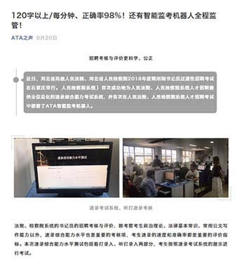 監(jiān)考機器人已成功服務(wù)了多次大規(guī)模考試,服務(wù)對象包括“全國稅務(wù)師職業(yè)資格考試”,“全國專利代理人資格考試”,“銀行專業(yè)人員職業(yè)資格考試”,“人民檢察院系統(tǒng)人才招聘考試”,以及“ACT(香港考點)”等等,廣受好評。